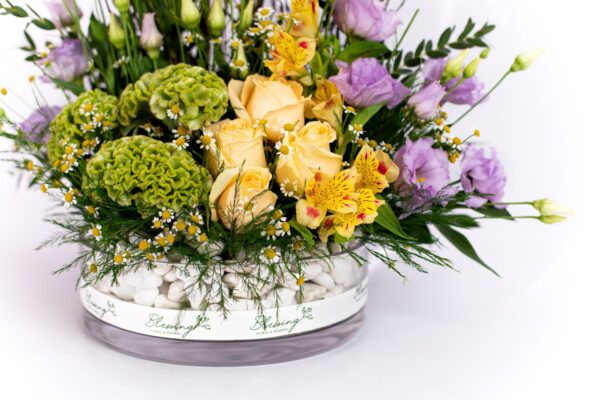 فازة سالوسيا الخضراء الرائعة مع أعواد الخشب والستوما الموف و الستروميريا الصفراء بالإضافة الى الاكسسوارات